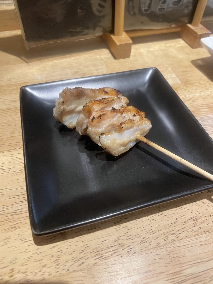 The restaurant’s specialty lies in its perfectly grilled skewers, offering a wide selection of flavors. Among the standout dishes is ねぎま (Negima), a delicious skewer of tender chicken and fresh spring onions, which are grilled to perfection. Another fan favorite is 月見つくね (Tsukune with egg), a savory chicken meatball topped with a raw egg yolk for that extra richness. For those looking for a more refreshing bite, 皮ポン酢 (Chicken skin with ponzu) provides a satisfying contrast of crispy chicken skin and a tangy citrusy sauce. And don't miss the なんこつ (Chicken cartilage), offering a crunchy and juicy texture that is sure to please any fan of yakitori. For a truly unique experience, try the 親鳥のたたきポン酢 (Chicken thigh tataki with ponzu), a lightly seared dish that perfectly blends the tenderness of the chicken with the zesty ponzu sauce.